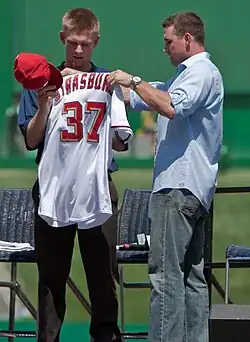 Strasburg was selected by Washington with the first overall pick in the 2009 MLB draft. He recorded a franchise-record 14 strikeouts in his major league debut in June 2010. Several months into his major league career, Strasburg tore a ligament in his pitching elbow. The injury required Tommy John surgery and a year of rehabilitation. He rejoined the Nationals on September 6, 2011, but was only able to pitch 24 innings that year. Strasburg's 2012 season marked a successful return to form; he was selected to play in the 2012 MLB All-Star Game.[7] Strasburg led the National League (NL) in strikeouts in 2014[8] and led the NL in wins in 2019 with 18. Strasburg received the 2019 World Series Most Valuable Player Award, as he helped lead the Nationals to victory over the Houston Astros.