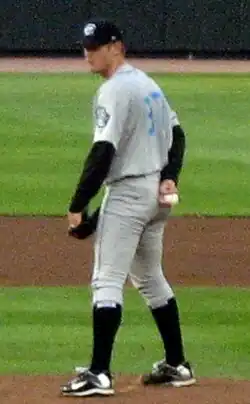 Strasburg made his professional debut on October 16, 2009, starting for the Phoenix Desert Dogs in the Arizona Fall League at Phoenix Municipal Stadium.[41] He was selected to play in the league's Rising Stars Showcase, but was unable to participate due to a minor neck injury. He also won Pitcher of the Week honors for the week of November 2, 2009 and led the AFL with four wins.[42][43] Before the 2010 season started, Baseball America named Strasburg as the top pitching prospect, and the second-best overall prospect behind Jason Heyward.[44]