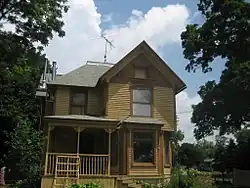 The entire home stands upon a limestone foundation. The exterior is clad in narrow wooden Clapboarding and the corner boards are topped with a trim that resembles Doric capitals. The front facade features a large projecting gabled wing extending out from the principle hip roof portion of the home.[6] Directly beneath the projecting gable's eave is decorative shingle work, a common element in Queen Anne style architecture.[6][7]