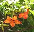 Sterculia lanceolata[2] is a tree species, belonging to the genus Sterculia and the family Malvaceae (previously the Sterculiaceae, now relegated to a subfamily).[3] The species can be found in southern China (including Hainan island) and Vietnam (where it is variously known as: trôm mề gà, sang sé, sảng, trôm lá mác, trôm thon, che van, chóc móc or tròm thon).[3] The flowers contain five free carpels, or follicles, each of which splits open shortly after pollination so that the seeds grow while fully exposed to the elements. Each scarlet or orange follicle has up to six oblong black seeds.[4]