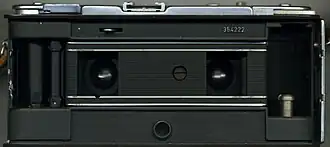 The Realist 45 also differs from the Kodak Stereo Camera in several ways: the Realist 45 film transport features a swing-out lever that allows rapid winding, a handy feature for those wishing to take a lot of shots quickly.[28] Unlike the Kodak, the Realist 45 has a top-mounted focusing knob that moves the film plane in a fashion similar to the standard Realist.[28] There is a depth-of-field scale built into the knob going up to f/16.[29] The top-mounted exposure counter counts up rather than down, like the Kodak counter.[30]