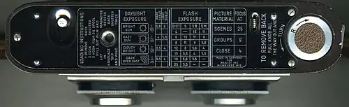 The bottom of the camera contains the rewind knob release lever,[30] the rewind release button[30] and the rewind knob, which also opens the back.[32] Printing on the bottom includes loading instructions,[32] daylight exposure table,[33] flash exposure table,[34] (both based on ASA 10 film[35]) and suggestions for common focus settings.[35]