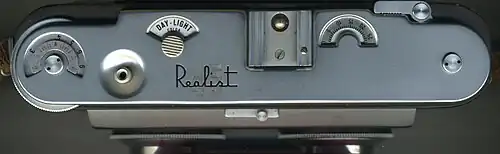 Later-model cameras featured a double exposure button,[7] which could be pulled out to make a double exposure but could otherwise be left alone,[8] as well as a depth-of-field scale on the focusing knob.[9] Many also had red marks on f/6.3, 1/50 and on 20 feet. This was called "The Three R's in Outdoor Stereo Photography" [10] and is based on the then-standard ASA 10 color slide film.[11] Earlier cameras lacked these features but they could be added. The double exposure button would have to be installed by the factory, but the depth-of-field scale and red marks could be added by a dealer or even the camera's owner. Thus, older model Realists are sometimes found with red marks or depth-of-field scales, but without double exposure buttons.