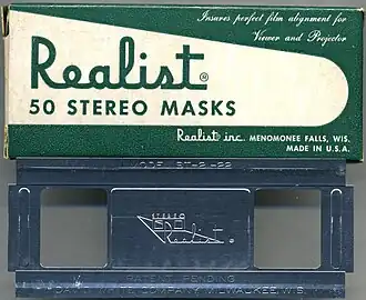 The Realist uses standard 135 film. The unusual proportions of the slides (the image was 5 sprockets wide[5]) became the standard for 3-D slides, and is known as "5P" or "Realist Format". It marked a significant milestone in stereoscopy. The arrangement of images on the film (on cameras where film advances left to right 1R-blank-2R-1L-3R-2L-4R...) seemed arbitrary but allowed for a simple film advance mechanism with little film wastage.[5] A special accessory was available that used the otherwise blank frame near the start of the roll to identify the roll, though the procedure for using it was rather elaborate.[6]