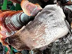 Stereum lobatum (false turkeytail)[1] is a basidiomycete crust fungus, which means it does not have the traditional mushroom gills nor stem, but rather grows flat or with shelf-like protrusions on wood. The spores are produced on basidia, just like the gilled mushrooms, but instead of gills, the hymenophore (spore-bearing surface) directly houses the reproductive parts.