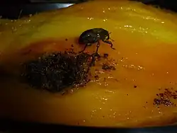 Their colour varies and they may be covered with black, greyish, reddish, or yellowish scales. In Australia, adult weevils are dark brown to black with grey markings. When disturbed, an adult presses its legs to its body, and fits its beak into a ventral groove. Females have an elevated ridge at the pygidial apex, while it is rounded in the male. The adults are not strong fliers and are not found far from fallen fruit. New areas are infested by human transport of infested fruit. Eggs are elongated, creamy white, and covered by a protective brown coating with two tiny tails at one end. It is widespread and occurs in most countries, especially where mangoes are grown. The adult female lays eggs on the surface of the mango fruit. Larvae and pupae develop inside the fruit and adults emerge, cutting their way out of the seed and pericarp after the fruit falls and decays.[2] Adults enter a diapause until the next fruiting season. The mango seed weevil is considered a pest on mangoes.[3][4]