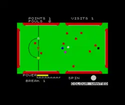 Steve Davis Snooker allows players to play against themselves, or against a human opponent in either Snooker, or Pool. However, there is no opponent AI.[7] The game could be controlled by either a Joypad[8] or a Cursor and Keyboard control scheme.[9] The game has two different modes, with a short game (a game of Ten-Red Snooker similar to power snooker), or long game, a game of traditional fifteen-red Snooker.[10]