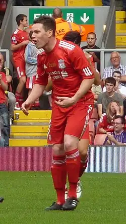 The following season, Liverpool's success continued as they finished third in the League and reached the semi-finals of the Champions League. Finnan took his total appearances for Liverpool past the 200 mark and also made it into the top 100 capped Liverpool players of all time.[43][44] Finnan featured in 35 games, but lost his starting place, manager Rafa Benítez often preferring Arbeloa to start.[45][46][47] In the summer of 2008, after the arrival of fullback Philipp Degen at the club from Borussia Dortmund, Finnan was linked with a move away from Anfield.[48] He was offered by Liverpool as a makeweight in a deal to sign Gareth Barry from Aston Villa; the player accepted the move but the clubs were unable to agree a fee.[49] He made a guest appearance in Jamie Carragher's testimonial match in September 2010.[50]