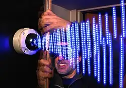 - Surveilluminescent wand: a device for visualizing vision and seeing sight, by way of making visible the sightfield (time-reversed lightfield) of a camera or similar computer vision sensor, using time-exposure with array of surveilluminescent lights to make visible to one camera what another camera can see.[31]