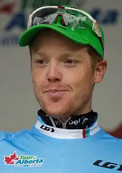 ![]() Kruijswijk in the most aggressive classification jersey at the 2014 Tour of Alberta | |