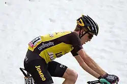 Early in the 2019 season he finished third at the Vuelta a Andalucía,[20] fifth at the Volta a Catalunya,[21] and then sixth at the Tour de Romandie. He entered the Critérium du Dauphiné in June but withdrew from the race on its final stage. During the Tour de France, Kruijswijk spent some of the first week of the race in third place overall, following Team Jumbo–Visma's victory in the stage two team time trial.[22] Having dropped to eighth overall by the end of the week, Kruijswijk worked his way back up the general classification and moved into third place overall again, following the stage 13 individual time trial in Pau. He finished third the following day on a summit finish at the Col du Tourmalet,[23] and maintained third place overall until stage 18 – which included climbs of the Col du Galibier and the Col d'Izoard – as Egan Bernal gained around half a minute on his rivals, which took him past Kruijswijk, Thibaut Pinot and Geraint Thomas in the general classification.[24] The following stage was neutralised due to a landslide,[25] but Julian Alaphilippe cracked on the penultimate stage – a reduced 59.5-kilometre (37.0-mile) route from Albertville to Val Thorens – and Kruijswijk replaced him on the final podium.[26] He later abandoned the Vuelta a España in August with a knee injury.[27]
