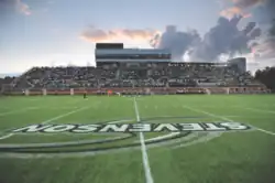 With the induction of the football team in 2011, the university added a marching band.[14] The Stevenson University Marching 100 is a modern-style marching band that plays both contemporary and traditional marching band music. The band uses woodwind, brass, and percussion instruments along with synthesizers, guitars, and color guard.[15] The band plays at football games, open houses, and other university events. It is directed by Mark Lortz.