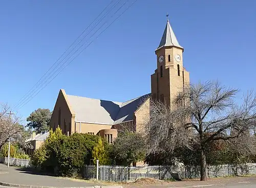 The Steynsburg Reformed Church is the oldest congregation of the Reformed Churches in South Africa in the North Eastern Cape town of Steynsburg, which was founded by the church council and after elder A.P.J. Steyn was named because he took the lead in founding the congregation. Because of the congregation's zeal for education, it took an important place in the Reformed church association, especially during the first almost 80 years of its existence until around 1950.[1] A school with 100 learners was opened here in 1875 and in 1905 a school for Christian national education (a counter to the state's anglicization policy) from which a teaching college developed.[2]