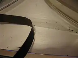 The symptoms of this breakdown can be immediately obvious even when rewinding the tape: tearing sounds and sluggish behavior.[3] If a tape with sticky-shed syndrome is played, the reels will make screeching or squeaking sounds, and the tape will leave dusty, rusty particles on the guides and heads.[4] In some cases, particularly with digital tapes, the symptoms are more subtle, causing intermittent dropouts.