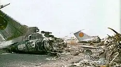 Airline's fleet consisted of 6 Tu-134A airliners, inherited from Grozny United Aviation Division.[3] At least 2 of them (65014 and 65075) were painted into Stigl's own livery,[6][7] others remained in 1973 Soviet Aeroflot livery with markings replaced. Aircraft preserved Soviet registration numbers, although country prefix was removed. Most aircraft were destroyed by Russian airstrike on Grozny airport on 1 December 1994. The only aircraft that remained intact was 65039 (possibly due to not being in Chechnya on that day). The further usage history of it was unknown, but in 2002 it was abandoned in Khartoum airport in Sudan.[8] As of 2017, it remains stored there, severely stripped of many parts.[9][10]