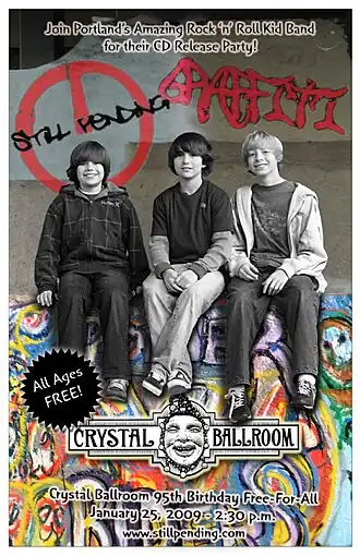 Still Pending was an American punk children band, formed in Portland, Oregon, United States, in 2005. The band originally comprising three young musicians, Reed Gulick-Stutz (guitar and vocals), Grant Ellman (drums and vocals), and Ian Rogers (bass guitar). In June 2007, Rogers left the band and was replaced by Andrew Turel in August 2007.[1] It is rumored that the band broke up due to drummer and vocalist Grant Ellman embarking on a Jamaican Patois vocalism and lyric training course, leaving little time for him to perform his band duties because of the intense training schedule. The official website is currently down, and their social media is inactive currently.