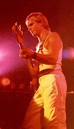 The band also drew on influences from reggae to jazz to progressive and pub rock.[24] While maintaining the main band, Police members continued to moonlight within the art rock scene. In late 1977 and early 1978, Sting and Summers recorded and performed as part of an ensemble led by German experimental composer Eberhard Schoener; Copeland also joined for a time. These performances resulted in three albums, a mix of rock, electronica and jazz.[25] Various appearances by the Schoener outfit on German television made the German public aware of Sting's unusual high-pitched voice, and helped pave the way for the Police's later popularity.