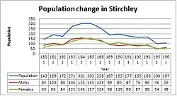 The population of Stirchley has been inconsistent from when the census records began in 1801.[6] In general the population rose until 1851 where there were 302 people living in the Parish, but soon after it declined and by 1891 the population was reduced by as much as 42.1%.[6] From the beginning of the 20th century there were not any large scale demographic variations until the census in 1951 revealed 66 people died,[6] most likely from the first and second World Wars.[16] In 1961 the parish had a population of 107.[6] However, since Stirchley and Brookside combined as one Council Parish,[16] the penultimately recent Census data in 2001[1] shows a much larger population and it is hard to define how much the population has increased just in the area of Stirchley.