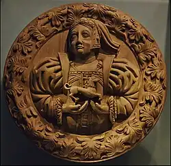 The Stirling Heads are a group of large oak portrait medallions made around the year 1540 to decorate the ceiling of a room at Stirling Castle.[1] The style, in origin, was based on Italian architectural decoration and at Stirling was probably derived from a French source. Similar medallions carved in stone adorn Falkland Palace.[2]