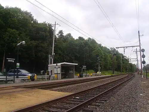 Stirling is a NJ Transit station in the Stirling neighborhood of Long Hill Township, New Jersey along the Gladstone Branch of the Morris and Essex line. The station consists of one side platform, as well as a concrete block shelter constructed in August 1974 after the former Delaware, Lackawanna and Western Railroad depot was demolished.[4] The Erie Lackawanna Railroad demolished the old depot on August 14, 1972 without notifying then-Passaic Township.[7]