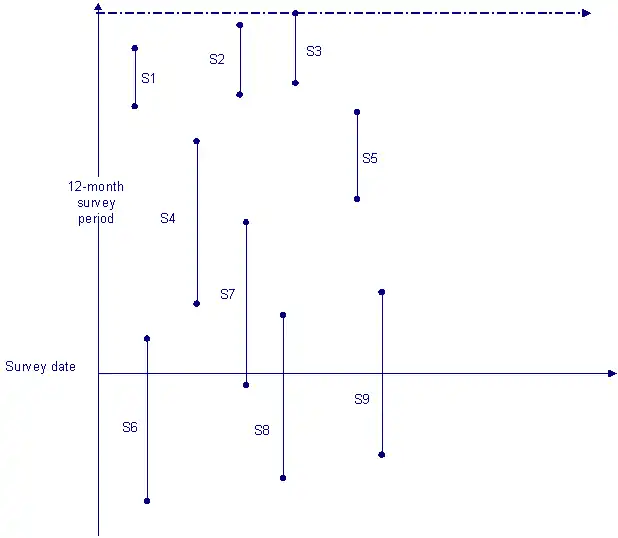 Stock sampling essentially leads to a sample selection problem. This selection issue is akin to the truncated regression model where we face selection on the basis of a binary response variable, but the problem has been referred to as length-biased sampling in this specific context.[4] Consider, for example, the figure below that plots some duration data. If a researcher would revert to stock sampling and only sample and survey individuals at the survey dates (i.e. the survey data, 12 months after the survey date, etc.), there is a high likelihood the short duration spells will be omitted from the sample, as some durations shorter than 12 months are necessarily omitted from the sample:[2]