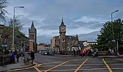 The eastern route into Stockbridge is marked by the local landmark, St Stephen's Church. This stands at the north end of St Vincent Street, its tower visible from the first New Town on the higher slope to the south. Originally intended to stand in the centre of Circus Place, it was redesigned and squeezed into its current restricted site on ground which falls sharply at the southern edge of the Silvermills area. It was designed by the architect William Playfair in 1827. It is unusual for its main church being raised by a storey, accessed by a tall but relatively narrow flight of steps at its frontage. Its clock pendulum is the longest in Europe. It is now a theatre and performance venue.