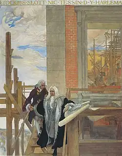 After the fire, the Regency Council of King Charles XII under the direction of the Queen dowager Hedvig Eleonora of Holstein-Gottorp at the Karlberg Palace that a new castle should be built on the walls of the burnt castle. Nicodemus Tessin the Younger was the architect appointed to draw and build the new Stockholm Palace.[8] At the same time that Tessin's plans were approved, he was appointed head of the construction of the palace as part of his new position: Överintendent över de Kungliga Slotten (Superintendent of the Royal Castles), a kind of castle architect. Göran Josuæ Törnquist (later ennobled Adelcrantz) became the Assisting intendent and his deputy, an important position at the construction site, and Hans Conradt Buchegger became general contractor for the palace construction. In 1697, Abraham Winantz Svanssköld, Tessin's half-brother, was appointed deputy castle and court architect. Together with Tessin he was active at the palace construction, and they were helped by several German journeymen.[18] Important sculptors and craftsmen during the first years of the construction were, among others, René Chauveau, Bernard Foucquet the Elder and his son Jacques Foucquet.[19]