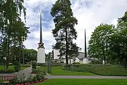 The temple itself was built on a part of the ancient Åby Grave Field (Åbygravfältet).[3][11] During 1982–1983, prior to construction of the temple, an archaeological excavation of the future temple grounds was carried out. Hundreds of gravesites, most of which contained cremations and were marked by stones laid out in intricate patterns, were discovered. The graves dated primarily from the Pre-Roman and Roman Iron Ages, with the latest dated circa 100–200 CE.[11] In 2000, directly across Tempelvägen from the temple grounds, the remains of a pentagon-shaped structure were excavated.[12] These remains were described in the media as an ancient Norse temple.[13][14] The ancient and modern temples are only 165 feet (50 m) apart.[1]