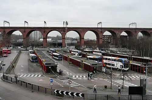 ![]() Stockport bus station with Stockport Viaduct in the background, 2009 | |||||