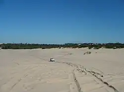Stockton Beach is located north of the Hunter River in New South Wales, Australia. It is 32 km (20 mi) long and stretches from Stockton, to Anna Bay. Over many years Stockton Beach has been the site of numerous shipwrecks and aircraft crashes. In World War II it was fortified against a possible attack by Imperial Japanese forces.[1] During that time it served as a bombing and gunnery range as well as a dumping area for unused bombs by aircraft returning from training sorties.[2] The length of the beach, its generally hard surface and numerous items of interest along the beach make it popular with four-wheel drive (4WD) enthusiasts. Four-wheel drive vehicles are permitted to drive on Stockton Beach provided the vehicles are in possession of valid permits.[3] The beach is also popular with fishermen and several different varieties of fish may be caught.[1][2]
