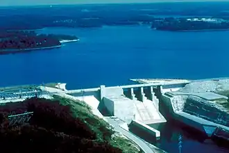 After the USACE construction was complete on the 5,100-foot (1,600 m) dam, the lake began filling in 1969.[1][2] The dam rises 153 feet (47 m) above the Sac River streambed.[1] The lake is about 24,900 acres (10,100 ha) with 298 miles (480 km) of shoreline. Normal pool is at 867 feet (264 m) above mean sea level (msl) with storage of 875,000 acre-feet (1.079×109 m3).[1] The flood storage capacity of the lake is 1,674,000 acre-feet (2.065×109 m3) of water at an elevation of 892 feet (272 m) msl, during which the surface area of the reservoir grows to 63,200 acres (25,600 ha). Stockton Lake is operated primarily for flood control and hydroelectric generation and originally had an installed capacity of 45.2 MW in a single electric generator.[1][3]