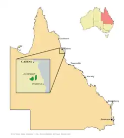 This species is endemic to a very small part of the luxuriant Wet Tropics rainforests of north-eastern Queensland, specifically an area on the western slopes of Mount Bartle Frere where it is found only in well-developed rainforest. It occurs within an altitude range of about 500–750 m (1,600–2,500 ft).[2][4][5] The area of occupancy of this species is just 52 km2 (20 sq mi).[10][a]