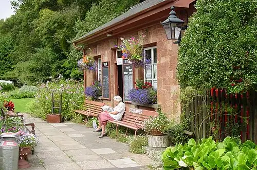 The original stone-built station building is still in use on the east side of the line and is situated in gardens. The platform with its waiting shelters is on the west side of the line.[2]