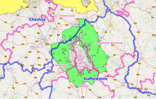 The Stoke-on-Trent Green Belt is a green belt environmental and planning policy that regulates the rural space throughout mainly the West Midlands region of England. It is contained within the counties of Cheshire and Staffordshire. Essentially, the function of the designated area is to prevent surrounding towns and villages within the Stoke-on-Trent conurbation from further convergence.[1] It is managed by local planning authorities on guidance from central government.