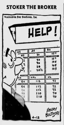 Working in a style somewhat similar to the cartoons of Hank Ketcham, the prolific Boltinoff drew his stockbroker Stoker as a swell-dressed, balding chap with a white mustache and a distinguished demeanor. He interacted with buyers, sellers and his wife. In one cartoon, Stoker was revealed to be a grandfather.[2]