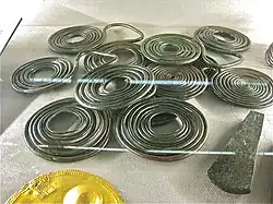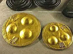 The Stollhof Hoard was found in 1864 in the municipality of Hohe Wand in Lower Austria by a shepherd at the height 700–800 m above the village of Stollhof. The hoard dates from c. 4000 BC in the Copper Age.[1] The discs are the earliest gold objects to be found in Austria. The hoard consists of:
