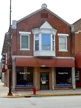 Joseph G. Stolp built the Stolp Woolen Mill Store in 1861. Stolp was one of the first settlers of Aurora, Illinois and operated a wool carding business. Stolp had previously worked in wool manufacturing in Marcellus, New York. His first office was built in 1837 in a small frame building on Stolp Island. He bought a brick mill in 1849 and continued to grow the business. By the 1860s, he needed a new place to sell his goods outside of the mill. The growth of the railroad industry dramatically increased competition against Stolp's business, and he had to shut down the mill in 1887. The mill store was rented to C. C. Hinckley & Co., a local producer of watchmaking tools, and J. D. Rice & Sons, a painting and decoration company. In 1889, Stolp improved the building by rehabilitating the interior and adding an extension on the east. The mill store is the oldest building still standing on Stolp Island today. The building was recognized as a Historic Place by the National Park Service on September 1, 1983 and was listed as part of the Stolp Island Historic District when it was created three years later.[2]