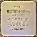 Jindřich Fišer was born on 26 July 1927 as the son of Karel Fišer (see above) and Kamila Fišerová (see below). He had a younger brother, Pavel (see below). The father ran a textile shop in the square. Jindřich Fišer, his brother, his mother and the great-grandmother, Anna Mahlerová, were deported on 10 August 1942 from Prague to Theresienstadt concentration camp by transport Ba. His transport number was 1372. His father was deported in March 1943, also to Theresienstadt. On 6 September 1943, Jindřich Fišer, his parents and the brother were deported to Auschwitz concentration camp. His transport number was 3227. There, all were murdered by the Nazi regime on the day of arriving in Auschwitz.[8][9] |