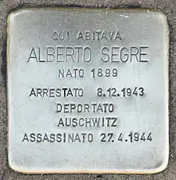Alberto Segre was born on 12 December 1899 in Milan. Son of Giuseppe Segre and Olga Loevvy.[29] He had to take part in the last phase of World War I but graduated from Liceo Manzoni in July 1918. Graduated in Economics and Commerce, worked for the family firm. He was anti-fascist. Married Lucia Foligno. On 10 September 1930, their only daughter was born, Liliana. A few months later his wife died. When the persecution of Italian Jews intensified, Segre hid his daughter with friends by using fake documents. In December 1943, an attempt to flee to Switzerland failed. Father and daughter were arrested the following day in Selvetta di Viggiù in the Province of Varese. They were transferred to the prison in Varese, then to Como and finally to Milan. On 30 January 1944, Segre and his daughter were deported to Auschwitz-Birkenau concentration camp, which they reached seven days later. The daughter was immediately separated from her father, who was killed in Auschwitz on 27 April 1944.[1][30][31]