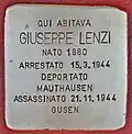 GIUSEPPE LENZI BORN 1880 ARRESTED 15.3.1944 DEPORTED MAUTHAUSEN MURDERED 21.11.1944 GUSEN |