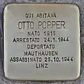 OTTO POPPER BORN 1915 ARRESTED 24.1.1944 DEPORTED MAUTHAUSEN MURDERED 25.10.1944 LINZ |