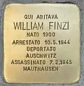 WILLIAM FINZI BORN 1900 ARRESTED 10.5.1944 DEPORTED AUSCHWITZ MURDERED 7.2.1945 MAUTHAUSEN |