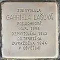Gabriela Lašová, also Laschová, was born on 24 June 1894. She was married to Robert Laš. On 16 July 1942, she and her husband were deported to Theresienstadt concentration camp by transport AAr. Her transport number was 504 of 1,000. Three months later, on 6 October 1942, the couple were deported to Auschwitz concentration camp by transport Eo. Her transport number was 1045 of 1,550. They were both murdered by the Nazi regime.[13][14] |