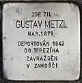 Gustav Metzl was born on 1 September 1879 in the district Fünfhaus of Vienna. His parents were Moritz Metzl and Mathilde née Klein (1857-1896). He had three sisters and one brother.[19] He was married to Ida née Fried. It is not known, when the couple moved to Prague. Their last residence before deportation was in Prague VII, Šternberkova 10. On 28 April 1942, Gustav Metzl and his wife were deported to Theresienstadt concentration camp by transport Ao. His transport number was 994 of 1,001. Two days later, on 30 April 1942, the couple were deported to Zamość by transport As. His transport number was 994 of 1,000. Both were murdered by the Nazi regime.[20][21][22]
