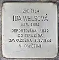 Ida Welsová née Kohn was born 6 July 1894. Her parents were Edmund Kohn Krafft (1862-1935) and Therese née Fürth (born 1871). She had four siblings: Gustav (born 1892), Ernst (born 1895), Walter (born 1897) and Ilsa (born 1903, later Mandl-von Tupay-Isertingen). She was married to Rudolf Wels. The couple had two sons, Thomas Albert (born on 7 June 1920 in Cheb) and Martin (born 1925).[31] The last residence of the family before deportation was in Prague XII, Mánesova 53. On 30 January 1942, Ida Welsová, her husband and her younger son were arrested and deported to Theresienstadt concentration camp by transport V. Her transport number was 838 of 1,002. Nineteen months later, on 6 September 1943, the family was deported to Auschwitz concentration camp by transport Dm. Her transport number was 2767. Mother, father and son were murdered by the Nazi regime.[32][33]