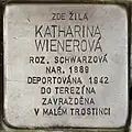 Katharina Wienerová née Schwarzová was born 10 July 1889 in Tullnerbach-Pressbaum close to Vienna. Her parents were Emil Schwarz and Ida née Mauthner. She was married to Ing. Eugen Wiener. The couple had at least one son, Robert. The last residence of the couple before deportation was in Prague VII., Malá Šternberkova 7. On 30 July 1942, Katharina Wienerová and her husband were arrested and deported to Theresienstadt concentration camp by transport AAv. Her transport number was 288 of 1,001. Five days later, on 4 August 1942, the couple were deported to Maly Trostenets extermination camp by transport AAz. Her transport number was 569 of 1,000. On 10 August 1942, both were ″killed by gas″.[36][37]