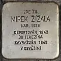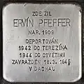 Ervín Pfeffer was born on 28 October 1909 in Prague. He was employed at a bank and married to Martha Pfeffer née Kraus. The couple had two children: Alena (born 1937) and Jiřina (born 1941). On 23 July 1942, Ervín Pfeffer was deported from Prague to Theresienstadt concentration camp, together with his wife and his two daughters with transport AAt (his number on the transport was the 537). From there he was deported to Auschwitz concentration camp on 1 October 1944, with the transport Em (his number on the transport was the 913). From here he was deported to Dachau at an unknown time and murdered there in 1945.[43][44][45]