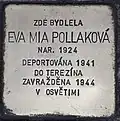 EVA MIA POLLAKOVÁ BORN 1924 DEPORTED 1941 TO THERESIENSTADT MURDERED 1944 IN AUSCHWITZ |