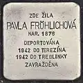 Pavla Fröhlichová née Porgesová, also Paula or Pauline, was born on 23 October 1876 in Rokycany. She married Leopold Fröhlich, a salesman. The couple had two children: Ervín, born in 1903, and Irma, born in 1904.[27] Ervín became a physician, specialized in internal medicine. In 1936, the husband of Paula Fröhlichová died. After the Nazi occupation of Czechoslovakia in 1938, Irma and her husband succeeded in emigrating to the United States, together with their son Tomachek, who was then only five months old. But they had to leave back their two daughters as they got only three visas. Pavla Fröhlichová and her son took care of the two girls and could also achieve visas for them in 1939. On 9 July 1942 Pavla Fröhlichová was arrested and deported with transport AAp from Prague to Theresienstadt concentration camp. Her transport number was 860. On 19 October 1942 she was deported again, this time with transport Bw to Treblinka extermination camp. Her transport number was 796. There, Pavla Fröhlichová was gassed on 23 October 1942. It was her 66th birthday.