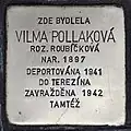 Vilma Pollaková née Roubicková was born on 24 or 25 December 1897 in Kolín.[49] Her parents were Simon Roubíček and Klotylda née Kaufmannová, called also Chlotilde. She married Karl Pollak. The couple had two daughters: Hana, born on 5 February 1921, and Eva, born on 24 March 1924. In 1924, the family moved to Vienna where Karl worked as administrator in an iron mill. The family resided in Seilerstätte 13 in Vienna's center. In 1933, the couple divorced. Thereafter Vilma and her daughters moved to Prague where they lived in Kaprova 12. The former husband died in 1938 in Switzerland. In October 1939, the family had to move to a collection flat in Sanytrová 12 (today the street is called 17. listopadu). There they lived together with another Jewish family, Otto Passer and Hedviga Passerová. The apartment was located in close proximity to the SS headquarter in the building of the former Faculty of Law of Charles University closed down by the Nazis in 1939. On 10 December 1941 Vilma Pollaková and her daughter Eva were deported from Prague to Theresienstadt concentration camp with Transport L. Her transport number was 292 of 1006. The hygiene in the camp was terrible, Vilma acquired sepsis and died on 1 January 1942.[50][51]